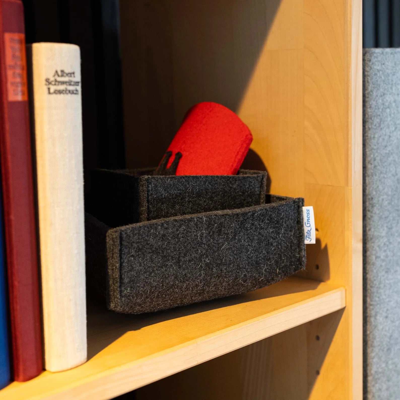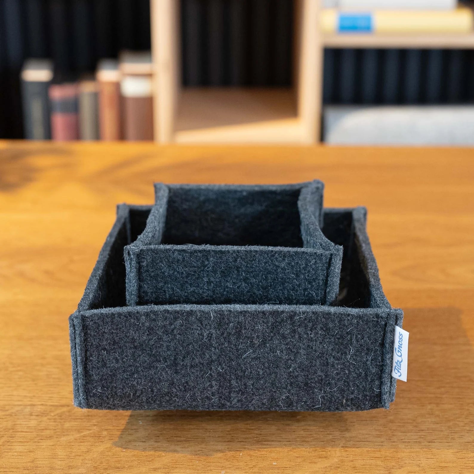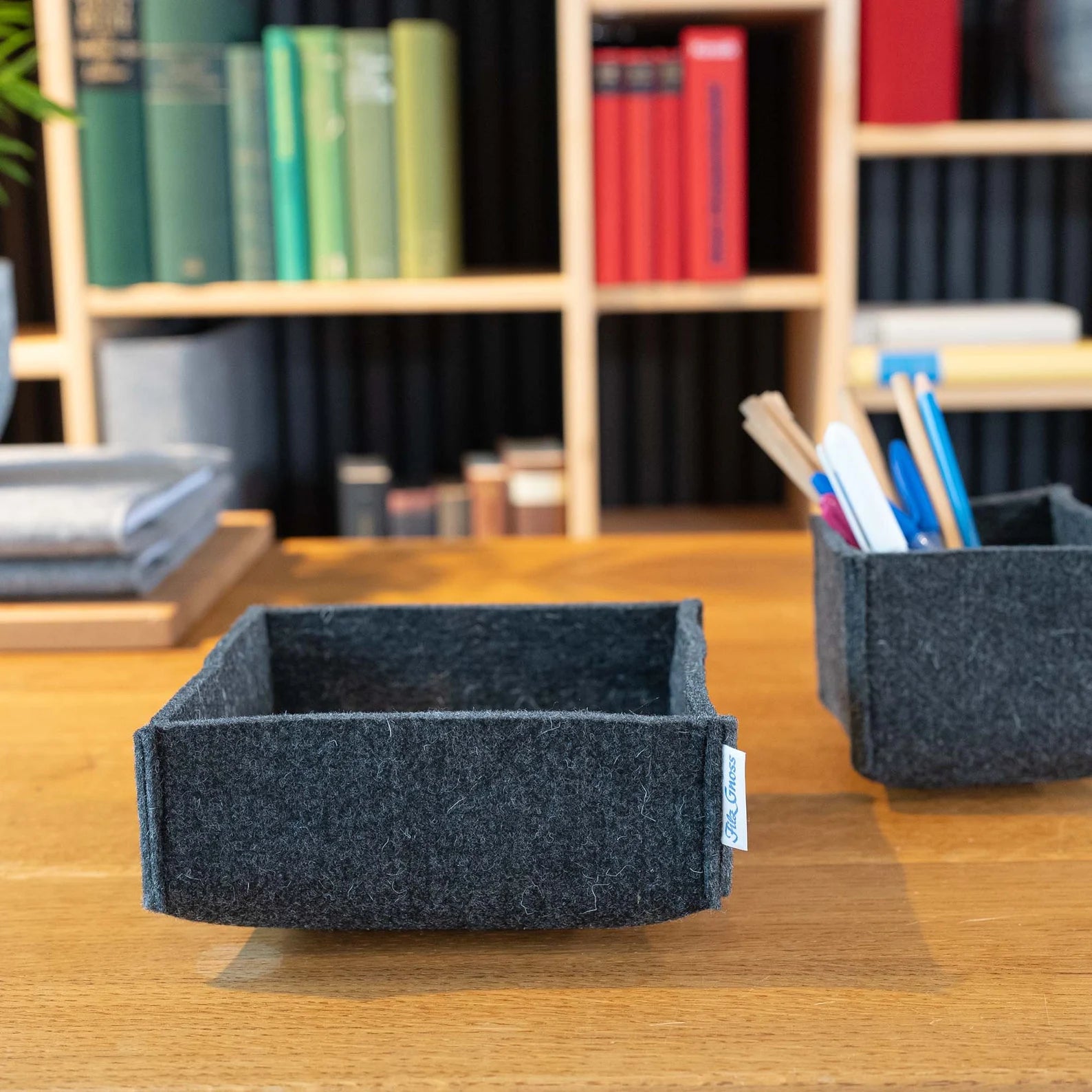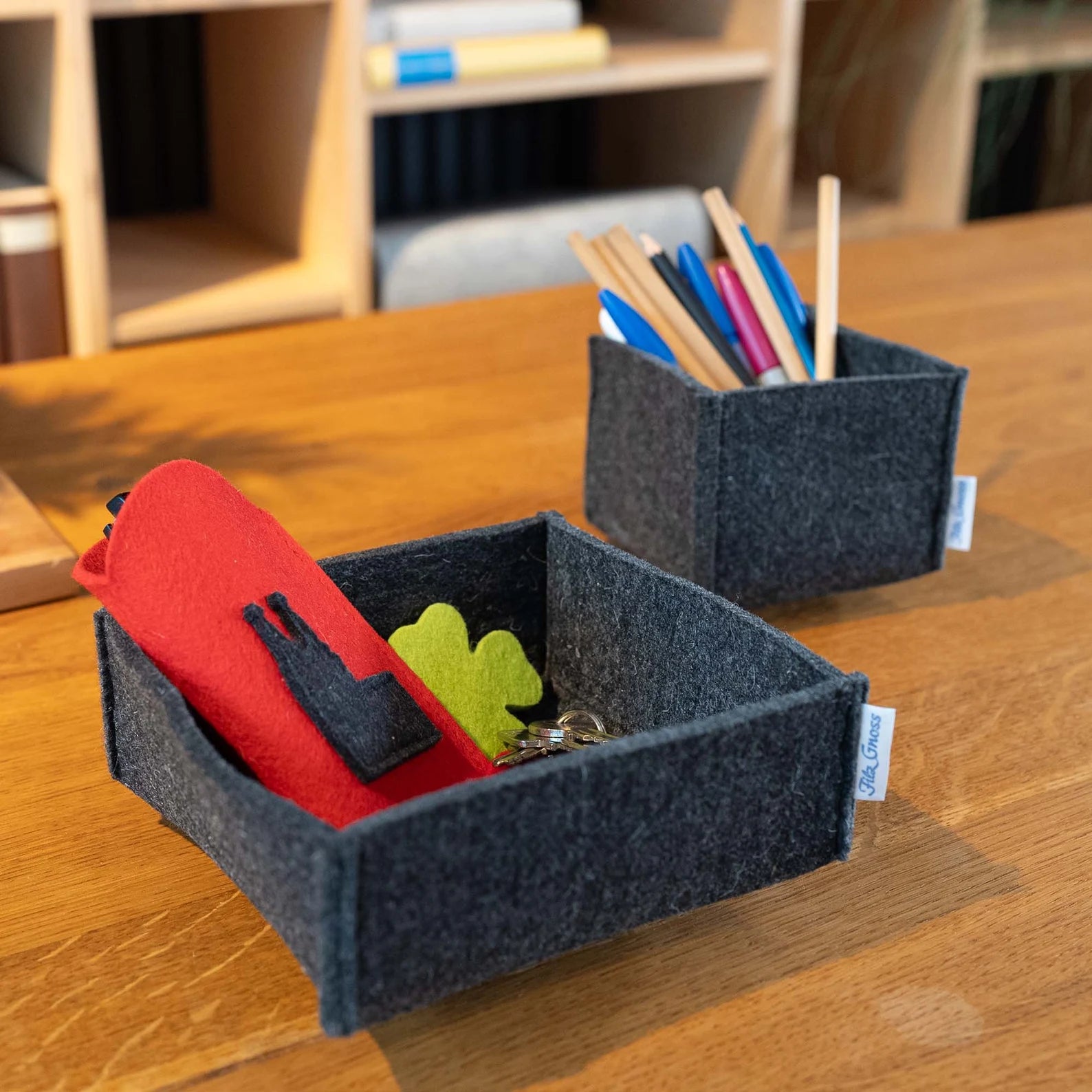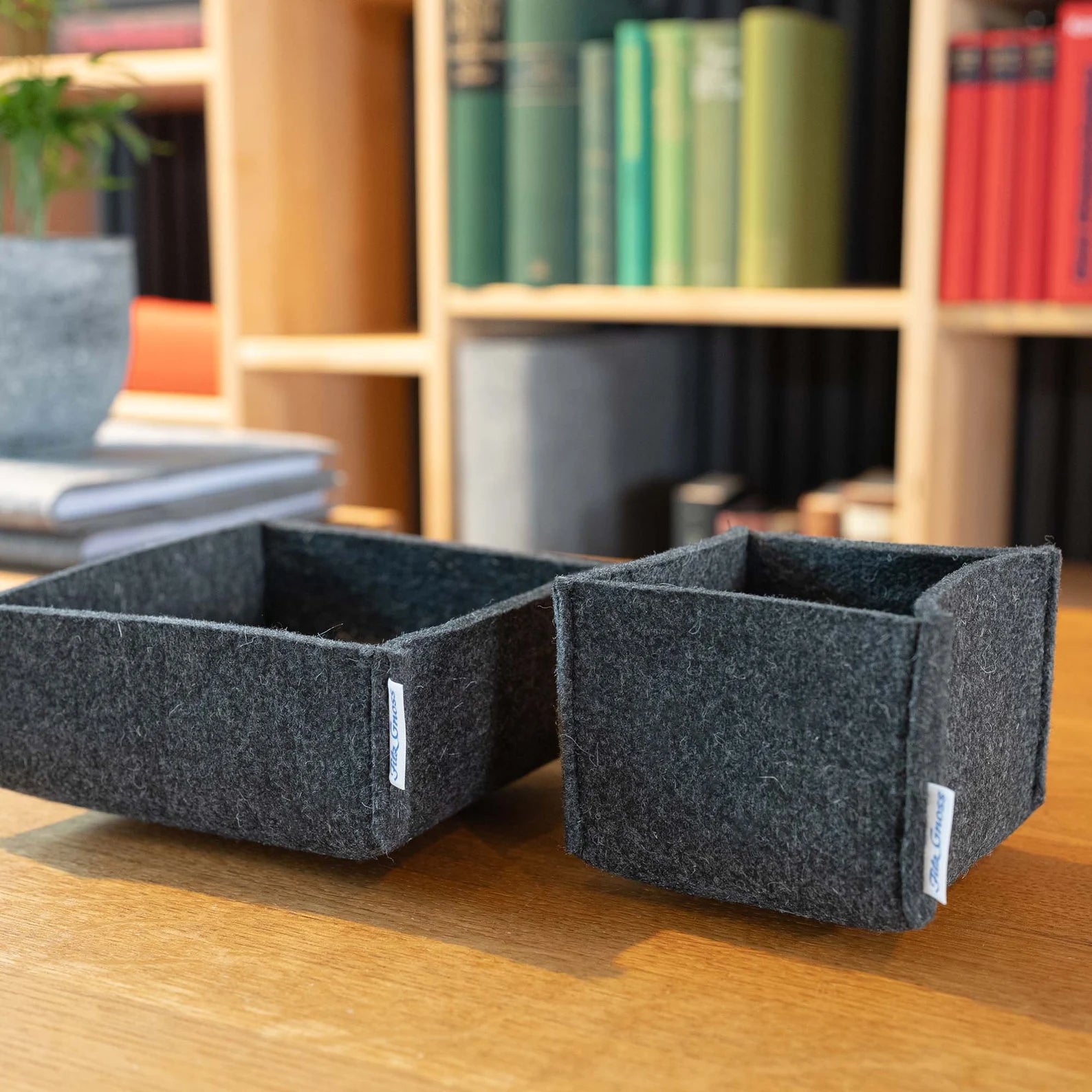 Die Körbe sind in Anthrazit erhältlich, was ihnen eine zeitlose Eleganz verleiht. Sie bestehen aus hochwertigem 5 mm Filz, der zu 30 % aus reiner Wolle und zu 70 % aus synthetischen Fasern besteht. Dies macht die Körbe robust und langlebig.